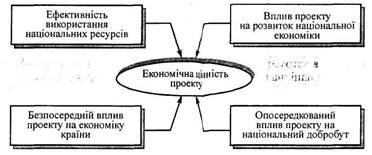 Для визначення економічної цінності проекту використовують поняття альтернативної вартості, тіньових цін, невідчутних вигід і витрат, трансфертних платежів, споживчого надлишку та екстерналій. З'ясування економічної цінності проекту надає можливості оцінити, наскільки позитивні результати (вигоди) перевищують його негативні наслідки (втрати) для суспільства, якою буде величина виграшу нації в разі реалізації проекту.