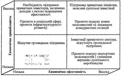 На практиці аналітики досить часто користуються методом позиціювання інноваційних проектів за критеріями економічної привабливості й ефективності, для чого відносять проект до одного з квадратів матриці (рис. 2), яка відображає позицію уряду щодо підтримки тих чи інших проектів.