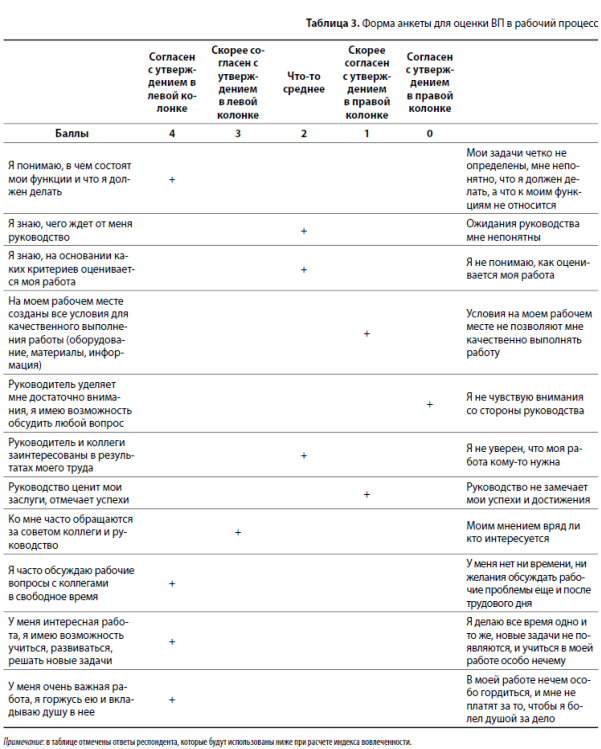 Наша методика включает следующие критерии ВП в рабочий процесс: 1) понимание своих задач и функций, знание ожиданий руководства и критериев оценки; 2) наличие возможностей и условий (оборудование, материалы, информация) для качественного выполнения работы; 3) регулярная позитивная оценка труда, признание заслуг руководством; 4) постоянное внимание к работнику, демонстрация заинтересованности в результатах его труда со стороны коллег и руководства; 5) интерес к мнению и оценкам работника со стороны коллег и руководства, неформальное общение на рабочие темы, регулярный, свободный и заинтересованный обмен мнениями; 6) возможность учиться и развиваться, профессионально расти в процессе работы, решать новые задачи и получать помощь в их реализации; 7) осознание важности собственной работы, гордость за профессию и свою компанию.