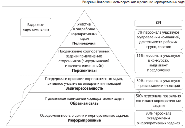 И наконец, максимальный уровень ВП характеризуется участием в разработке корпоративных задач. Сотрудники, имеющие такой уровень вовлеченности, — это творцы, которые сами создают настоящее и будущее компании, участвуют в работе органов управления, причем не только в качестве руководителей, но и как инициаторы любых инноваций (рационализаторы, победители конкурса инициатив, члены общественных советов).