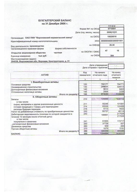Приложение 1. Бухгалтерский баланс ф. №1 за 2006 год