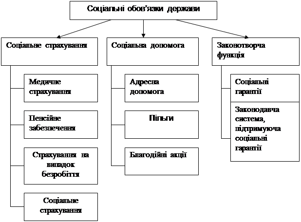 Тому головним питанням в сучасних умовах є перегляд соціальних обов’язків держави за обсягом та змістом. На даний момент внесок держави в соціально-трудові відносини має три основних напрямки: соціальне страхування, соціальна допомога, законотворча функція. Більш наглядно соціальні обов’язки держави краще за все розглядати за схемою, наведеною на рис. 2.