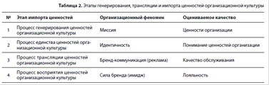 Миссия генерирует организационные ценности, которые транслируются лидерами, создают аксиологические ориентиры организационной культуры, выстраивая систему ценностной идентификации сотрудников и условия для импорта организационных ценностей во внешнюю среду (через бренд-коммуникации или прямые продажи). Таким образом, бренд — это составляющая миссии, преломленная сквозь призму организационной культуры. В табл. 2 представлены этапы генерирования, трансляции и импорта ценностей.
