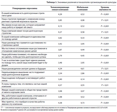 Сравнивая полученные данные двух компаний и пользуясь непараметрическими методами статистического анализа, мы обнаружили значимые различия в параметрах организационной культуры (табл. 3).