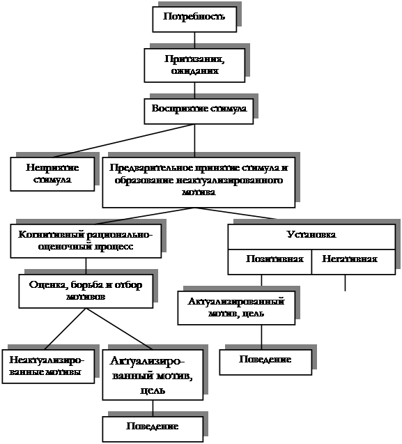 Он включает в себя потребность, притязания, стимулы, установки, оценки и т.д. (см. схему).