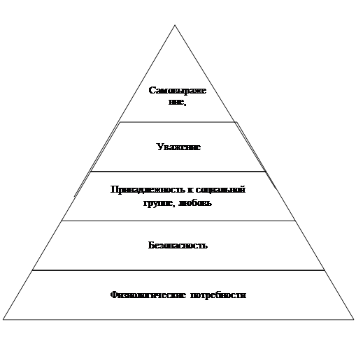 Одна из самых популярных и ясных концепций трудовой мотивации исходит из определения потребностей человека, их иерархии и объясняет необходимость в труде как средстве удовлетворения этих потребностей. Концепция определения иерархически упорядоченных уровней потребностей человека была изложена и обоснована американским психологом Абрахамом Маслоу в 1943 г. в журнале "Психологическое обозрение" и затем развита в его знаменитом труде "Мотивация и личность" (странно, что фамилия Маслов славянского происхождения в русском переводе стала звучать как Маслоу). Эти потребности формируют и развивают жизненные цели человека, определяют направление его усилий для реализации своих потенциальных возможностей (рис. 1).