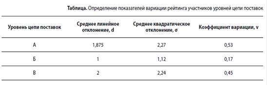 Так, из рис. 2 и таблицы видно, что наибольшим интеграционным потенциалом обладает участник анализируемой цепи поставок, функционирующий в уровне А, наименьшим интеграционным потенциалом — участник уровня Б (коэффициенты вариации соответственно 0,53 и 0,17).