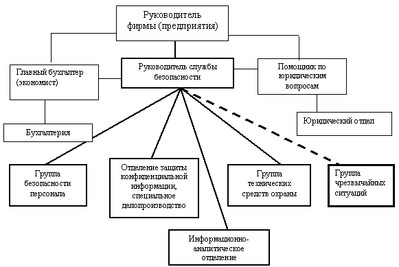 Приведем примерную структуру службы экономической безопасности предприятия (фирмы). Выделенные блоки непосредственно входят в службу экономической безопасности, а остальные – только в пределах вопросов, находящихся в компетенции СЭБ.