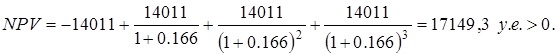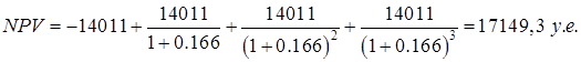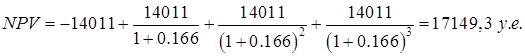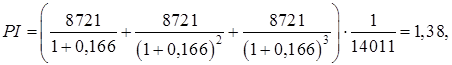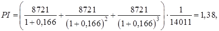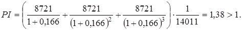 Здесь и ниже в работе будем полагать, что 1 у. е. = 1 $. Отметим также, что на момент 01.04.04 курс ЦБ РФ Американского доллара составлял 28 руб.13 коп. Здесь в первом слагаемом число 14011 у. е. с минусом соответствует полной себестоимости проекта, r=0,166, или, что то же самое, r=16,6% - уровень рентабельности (доходности) проекта. Для нашего проекта расчетная величина больше нуля, значит проект прибыльный. 2) Расчет индекса рентабельности инвестиций (PI) Рассчитывается индекс рентабельности (Profitability Index) (PI) по формуле: