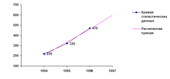 3a0 +6a1 =1010 6a0 +14a1 =2270 отсюда y=87+125t и график тенденции развития спроса на прибор "Биотест" будет иметь следующий вид Из графика видно что в 2005 году теоретический объем спроса составит 600 единиц продукции. Основной результат осуществления проекта - величина валовой прибыли от продаж рассматриваемого прибора в течение первого года работы составит 14011 у. е. при условии, что будет обеспечен прогнозируемый уровень продаж.