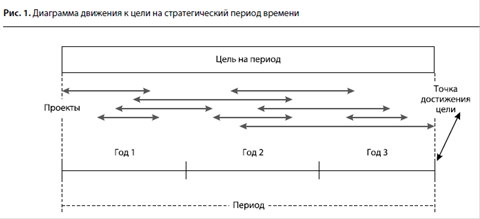 На рис. 1 представлена диаграмма, иллюстрирующая стратегический период времени с единой стратегической целью, на которую направлена как проектная, так и операционная деятельность в этом периоде.