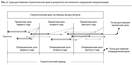 Исходя из этого становится понятно, что синхронизация проектных и операционных планов на стратегический период как разовая процедура принципиально невозможна. Такое мероприятие, сделанное в любой момент времени, нарушается последующим появлением новых работ и изменением старых и приводит к нарушению синхронизации в планируемой точке достижения стратегической цели, т.е. к ее срыву. На рис. 2 показано, как с течением времени из-за сдвига сроков и появления новых проектов (светло-серые стрелки) нарушается синхронизация проектной и операционной деятельности, выполненная в начальный момент времени (черные стрелки), а также то, как итоговые графики исполнения проектов (темно-серые стрелки) не позволяют достичь стратегической цели в запланированный момент.