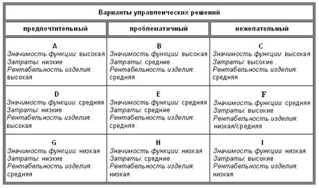 С учетом значимости функции изделия, его узлов, деталей и уровня затрат посредством ценообразования, основываясь на знании спроса на продукцию, определяется уровень ее рентабельности. Все это в совокупности служит цели принятия решения о выборе к производству конкретного изделия или направлений и масштаба его усовершенствования.