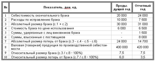 При анализе брака рассчитывают абсолютные и относительные показатели. Абсолютный размер брака представляет собой сумму затрат на окончательно забракованные изделия и расходов на исправление исправимого брака. Абсолютный размер потерь от брака получают вычитанием из абсолютного размера брака стоимости брака по цене использования, суммы удержаний с лиц-виновников брака и суммы взысканий с поставщиков за поставку некачественных материалов. Относительные показатели размера брака и потерь от брака рассчитывают процентным отношением абсолютного размера брака или потерь от брака соответственно к производственной себестоимости товарной продукции. Рассмотрим пример.