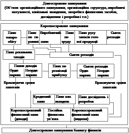 Життєдіяльність фірми неможлива без планування, "сліпе" прагнення до одержання прибутку приведе до швидкого краху. При створення будь-якого підприємства необхідно визначити цілі і задачі його діяльності, що й обумовлює довгострокове планування. Довгострокове планування визначає середньострокове і короткострокове планування, що розраховані на меньший термін і тому мають на увазі велику деталізацію і конкретику. Основою планування є план збуту, тому що виробництво орієнтоване в першу чергу на те, що буде продаватися, тобто користатися попитом на ринку. Обсяг збуту визначає обсяг виробництва, що у свою чергу, визначає план МТП. План МТП включає планування усіх видів ресурсів, у тому числі трудові ресурси, сировинні запаси і запаси матеріалів. Це обумовлює необхідність фінансового планування,планування витрат і прибутку. Планування повинне здійснюватися за твердою схемою, використовувати розрахунки багатьох кількісних показників.