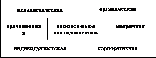 Согласно существующей теории и практике, взаимодействие на уровне «организация - внешняя среда» может осуществляться с помощью механистического или органического подходов и соответственно организация может получить одну из этих характеристик. Взаимодействие на уровне «подразделение- подразделение» реализуется с помощью комбинаций различных типов департменизации и выступает в рамках организационных структур: традиционной, дивизиональной или отделенческой, матричной. И, наконец, на уровне «индивид-организация» взаимодействие в зависимости от того, какая сторона играет лидирующую роль, может придать организации «индивидуалитский» или «корпоративный» характер. [9.c101]