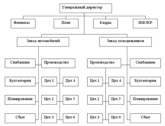 Особенностью этой модели организационной системы является выделение в составе организации хозяйственных стратегических подразделений и придание представлять собой отделение, филиал, группу цехов или отдельный цех, т.е. находиться на любом уровне иерархической системы. Ответственность за каждое направление, как в кратко, так и долгосрочной перспективе возлагается на одного управляющего директора (рис. 9).