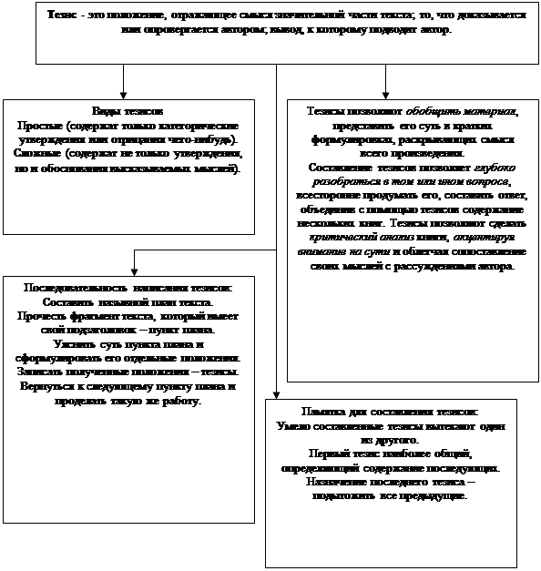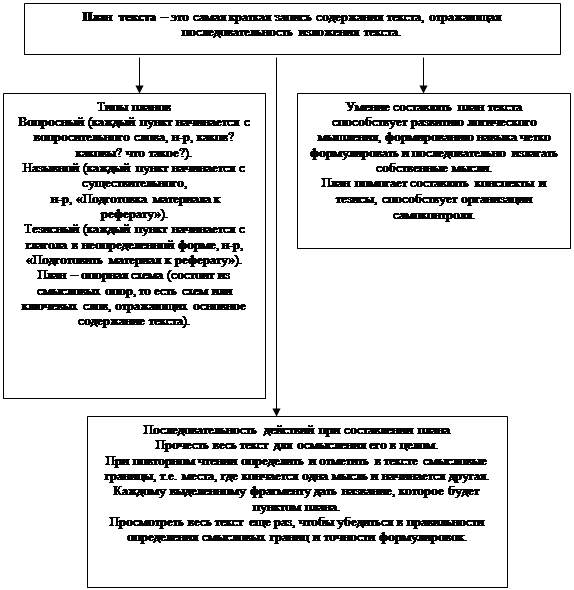 План - это основа текста, он компактно отражает последовательность изложения материала. План, как форма записи обычно значительно более подробно передает содержание частей текста, чем оглавление книги или подзаголовок статей. Удачно составленный план говорит об умении анализировать текст, о степени усвоения его содержания. Обрабатывая план при чтении текста, прежде всего, необходимо стараться определить границы мыслей, следить, чтобы заголовки-пункты плана наиболее полно раскрывали мысли автора.