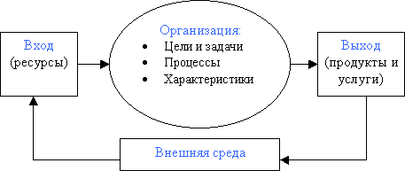 В контексте теории систем организация – это совокупность нескольких элементов, взаимодействующих между собой взаимозависимым образом. В упрощенной форме организация получает ресурсы (вход) из более крупной системы (внешней среды), осуществляет обработку этих ресурсов (процессы) и возвращает их во внешнюю среду в измененной форме (выпускаемые товары и услуги). На рисунке 1 представлены основные элементы организации как системы.