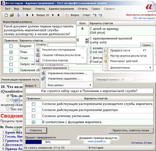 Позволяет организовать централизованное компьютерное тестирование для неограниченного числа пользователей, собрать всю информацию воедино, выявить существующие закономерности, исходя из целей и задач тестов, и выгрузить наглядные отчеты с результатами. Программа снабжена отличным редактором тестов, легкой и быстрой возможностью импортировать любые тесты, включает мастер анализа результатов. Фрагмент интерфейса программы представлен на Рисунке 1.
