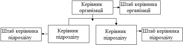 Аналогічні характеристики має і так звана лінійно-штабная структура управління, що також що передбачає функціональний розподіл управлінської праці в штабних службах різних рівнів (рис.2. Лінійно штабна структура управління організацією). Головна задача лінійних керівників тут - координація дій функціональних служб (ланок) і направлення їх в русло загальних інтересів організації.