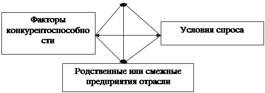 Наиболее фундаментальное исследование факторов конкурентоспособности предприятия было проведено в работах М.Портера. Факторы конкурентоспособности понимаются им как «одна из четырех основных детерминант конкурентного преимущества наряду со стратегией фирмы, ее структурой и конкурентами, условиями и наличием родственных или смежных предприятий отрасли и конкурирующих на рынке»