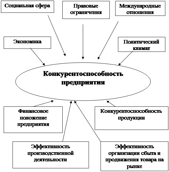 По мнению французских экономистов А.Оливье, А.Дайана и Р.Урсе, сталкиваясь с международной и внутренней конкуренцией, предприятие должно обеспечить себе уровень конкурентоспособности по восьми факторам: