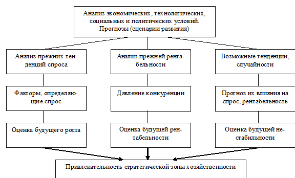 1) Оценка привлекательности СЗХ начинается с общего анализа и прогноза экономических, технологических, социальных и политических условий, на которые ориентируется предприятие. Среди применяемых методов прогнозирования глобальных условий внешней среды наибольшее распространение получил метод разработки сценариев будущих условий.