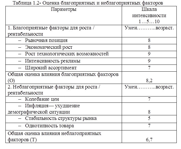 Соответствующим образом оценивается вероятность возникновения неблагоприятных и благоприятных факторов для роста (рентабельности) предприятия в данной СЗХ (таблица 1.2).