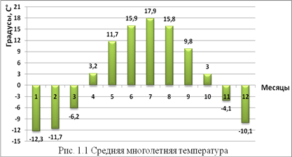 Как видно из приведенного выше графика резких перепадов температуры по месяцам не наблюдается. Но в некоторые дни месяцев бывает довольно большое отклонение от средней температуры месяца. Так, например, зимой бывает температура опускается до -30 °С, а летом поднимается до 27 °С. Иногда очень губительно для посевов озимых культур являются поздние заморозки долгая осень без снега.