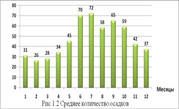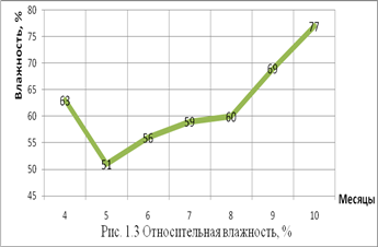 Также большое влияние на урожайность оказывают осадки и снежный покров. Особенно весной во время посевной, когда постоянно идет дождь, и нет возможности для проведения посевных работ, а раньше начинать сев также не позволяют климатические условия, в связи с поздним оттаиванием почв. Среднее количество осадков изображено на рис. 1.2, а относительная влажность на рис. 1.3.