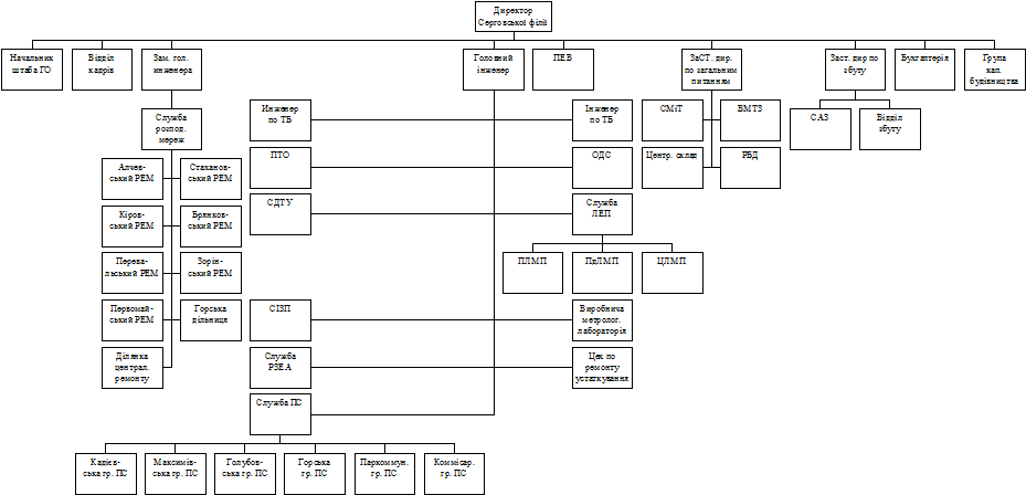Організаційна структура Серговської філії ТОВ «Луганське енергетичне об'єднання» має змішану схему керування з обслуговуванням підстанцій і ліній електропередачі напругою 35-100 квт за функціональною схемою, а розподільних мереж за територіальною схемою.