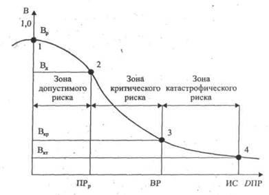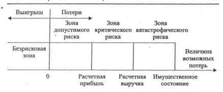 Следовательно, главное в оценке хозяйственного риска состоит в искусстве построения кривой вероятностей возможных потерь или хотя бы в определении зон и показателей допустимого, критического и катастрофического риска.