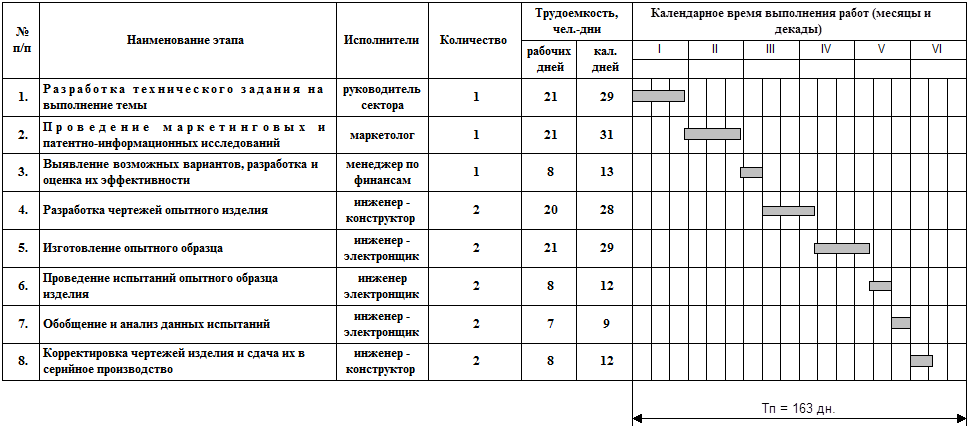 Календарное планирование инновационных проектов на стадиях проведения НИОКР имеет своей целью установление взаимосвязанных сроков начала и окончания работ по каждой теме с учётом имеющихся ресурсов. Календарное планирование отдельных НИОКР включает определение состава и последовательности этапов НИОКР, трудоёмкости, длительности и календарных сроков их выполнения, составление календарных планов-графиков работ по выполнению каждой темы, определение затрат и результатов от использования инноваций.