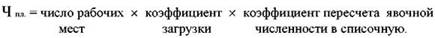 Применяемый в расчетных формулах коэффициент пересчета явочной численности в списочную позволяет учесть возможное отсутствие персонала на рабочих местах в течение планового периода времени изза болезни; очередного и дополнительного отпуска, отпуска по учебе, прочих причин неявок. Коэффициент пересчета определяется отношением числа фактически рабочих дней к числу календарных или номинальных дней. Для планирования численности персонала можно применить следующую формулу: