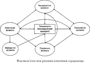 Типовою помилкою є врахування тільки технічних параметрів та ігнорування інших факторів навколишнього економічного, політичного, соціального середовищ, зв'язок між якими показано на рис.2.9