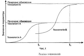 Для пояснення цього повернімося до методу S-кривих. Уповільнення зростання параметра для технології А свідчить про те, що значення цього параметра наближається до природної межі, тому необхідно подумати про заміну цієї технології на нову, для якої фізичне обмеження буде більшим, ніж для технології Л.