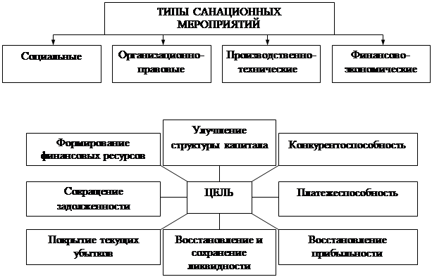 Санационные мероприятия организационно-правового характера направлены на усовершенствование организационной структуры предприятия, организационно-правовых форм бизнеса, повышение качества менеджмента, освобождение предприятия от непродуктивных производственных структур, улучшение производственных отношений между членами трудового коллектива. В этом контексте различают два вида санации: