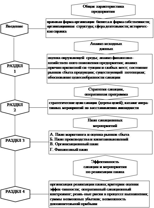Производственно-технические санационные мероприятия связаны, прежде всего, с модернизацией и обновлением производственных фондов, с уменьшением простоев и повышением ритмичности производства, сокращением технологического времени, улучшением качества продукции и снижением себестоимости, усовершенствованием ассортимента выпускаемой продукции, поиском и мобилизацией санационных резервов в сфере производства.