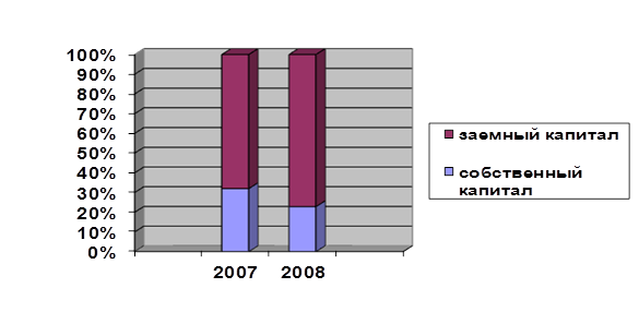 4. Актив баланса предприятия в течение всего анализируемого периода увеличивается. Согласно анализу состава, структуры и динамики пассивов, величина собственного капитала ООО «Япошка Сити» с каждым годом растет: на 6,34 % в 2007 году и на 19,25 % в 2008 году. В то же время более быстрыми темпами возрастает и величина заемного капитала организации: в 2007 году на 18,65 %, в 2008 году на 89,89 %. Общая величина заемных средств заметно превышает сумму собственного капитала. Соотношение собственного и заемного капитала составляет в 2007 году 0,47, в 2008 году 0,29.