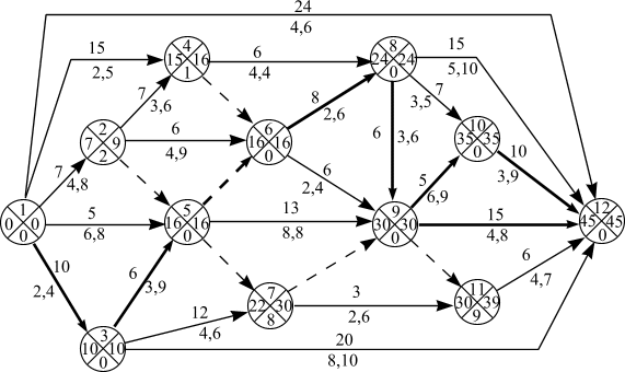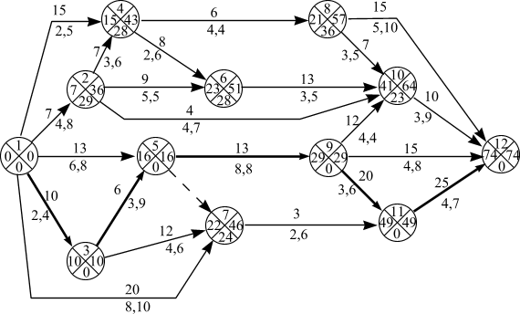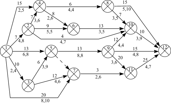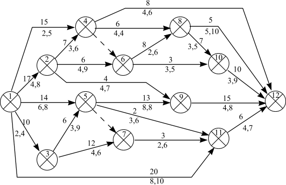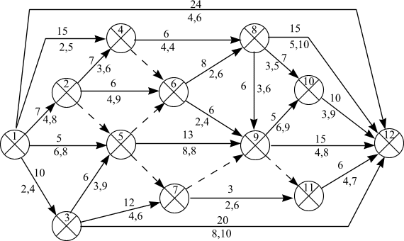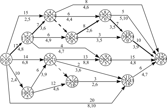 Критический путь составляют работы не имеющие никаких резервов времени: 1,2 – 2,4 – 4,6 – 6,8 – 8,10 – 10,12. Длина критического пути 49 дней.Изобразим критический путь на рисунке 3.1. Число работ в сетевом графике n = 24.