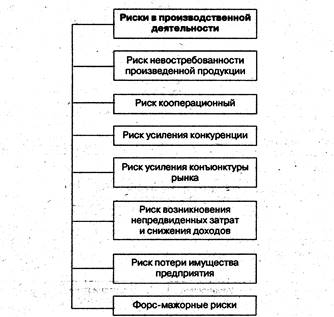 Процесс производства включает в себя несколько стадий, на каждой из которых предприятие может понести потери в результате ошибочных действий руководства или негативного воздействия внешней среды. При осуществлении производственной деятельности необходимо учитывать вероятность возникновения того или иного вида риска на каждой стадии производственного процесса, от закупки сырья до реализации готовой продукции. В целом система рисков в производственной деятельности приведена на рис. 2.2.