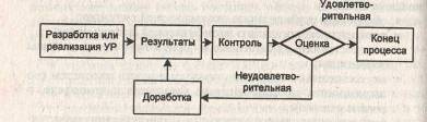 Контроль по результатам осуществляется на базе организационной, технической, экономической, финансовой и другой документации. Оценивается отклонение фактического результата от планового, зафиксированного в соответствующих документах. Например, контроль сроков, проработанности, согласованности с заинтересованными сторонами элементов бизнес-плана. Данный вариант контроля эффективен для циклических процессов с малым временем цикла, например, несколько часов или дней, при небольшой стоимости разработки или реализации УР. Путем корректировок УР можно постепенно, «цикл за циклом» совершенствовать УР, анализируя предыдущий результат разработки или реализации (рис. 9.1).