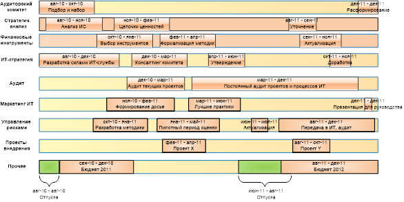 Для достижения поставленных целей, были разработаны следующие проекты: проект «организация аудиторского комитета», проект «стратегический анализ», проект «финансовые инструменты оценки», проект «ИТ-стратегия», проект «аудит», проект «маркетинг информационных технологий», проект «управление рисками», политические проекты Х и Y. Учитывая перечень проектов, а также их взаимосвязь, был разработан и описан план внедрения, определены временные границы каждого проекта. Совокупный бюджет предложений составляет 2 400 - 2 600 тыс. руб. до конца 2011 года в текущих ценах. Ожидаемый эффект при описанных условиях и допущениях оценивается в 3 300 тыс. руб.