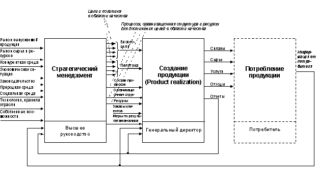 На самом верхнем уровне деятельность предприятия представляется в виде всего двух процессов - стратегического менеджмента и создания продукции. Стратегический менеджмент - это процесс высшего руководства (владельцев, наемных менеджеров, т.е. тех лиц, которые на конкретном предприятии выполняют функции стратегического планирования и выделения ресурсов). На выходе его бизнес - цели, бизнес-политика, стратегические планы и ресурсы, в том числе - цели и политика в области качества, планы и ресурсы для их достижения. Они служат входными элементами для процесса создания продукции. Под термином "создание продукции" понимается вся деятельность предприятия на протяжении жизненного цикла продукции - от маркетинга до послепродажного обслуживания и утилизации. Ответственность за этот процесс несет, как правило, наемный топ-менеджер предприятия (генеральный директор, исполнительный директор или другие лица подобного ранга). Третий процесс, - это уже деятельность не предприятия, а потребителя, связанная с потреблением продукции.