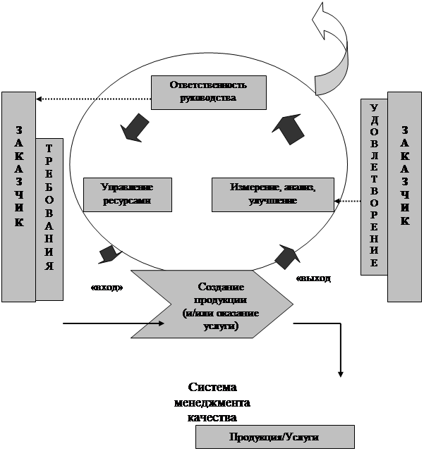 Процессуальная модель, представленная на рис. 1, не имеет целью отразить процессы в деталях. Вместе с тем, все требования к системе менеджмента качества по достижению соответствия продукции или услуги могут быть размещены внутри этой модели.