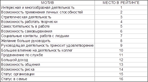 Анализ мотивов принятия функций руководителя (табл. 2) показал, что материальный фактор далеко не всегда является ведущим. Привлекательной оказывается сама суть управленческой работы – интересная и многообразная деятельность, возможность реализации личностного потенциала. Продвижение по службе, больший доход в структуре мотивов стоят лишь на 11-м и 12-м местах. Совершенно незначимыми оказались статусные факторы: статус в организации, статус в семье. Средние позиции занимают социальные факторы: возможность влиять на деятельность коллег, социальные контакты. [3 С. 58]