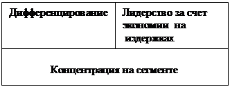 3. Стратегия концентрации на сегменте. Предприятия, решившие использовать эту стратегию, все свои действия направляют на определенный сегмент рынка. При этом предприятие может стремиться к лидерству за счет экономии на издержках, либо к дифференцированию продукта, либо к совмещению того или иного.