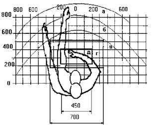 а – зона максимальной досягаемости; б – зона досягаемости пальцев при вытянутой руке; в – зона легкой досягаемости ладони; г – оптимальное пространство для грубой ручной работы; д – оптимальное пространство для тонкой ручной работы.
