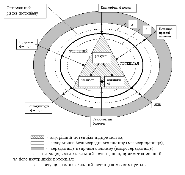 З огляду на зміст вище сформульованого визначення потенціалу підприємства та відповідно до середовища функціонування модель потенціалу підприємства може мати такий графічний вигляд (додаток 3).